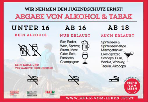 Wir nehmen den Jugendschutz ernst! Kein Ausschank von Alkohol und Tabak und verwandten Erzeugnissen an Jugendliche unter 16 Jahren. Hier kommt das Steiermärkische Jugendgesetz zur Geltung: https://www.ris.bka.gv.at/GeltendeFassung.wxe?Abfrage=LrStmk&Gesetzesnummer=20000626